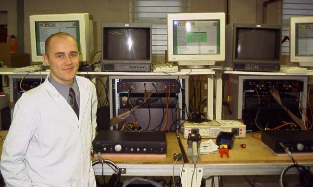 Mr Rob Collins, Arcam's chief production and test engineer, stands by three more QC Suite Stations used on the amplifier production line. On the bench are Arcam’s latest A65 integrated amplifiers.