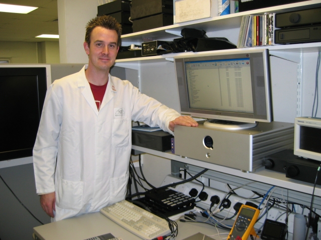 Mr Jon Beauchamp, Senior Technician in Naim Audio's production department, poses with their new Multichannel QC Suite. With both its AV2 processor and now the DVD5 player firing on not two but six channels, the ability to test a host of functions on all channels simultaneously is vital. |